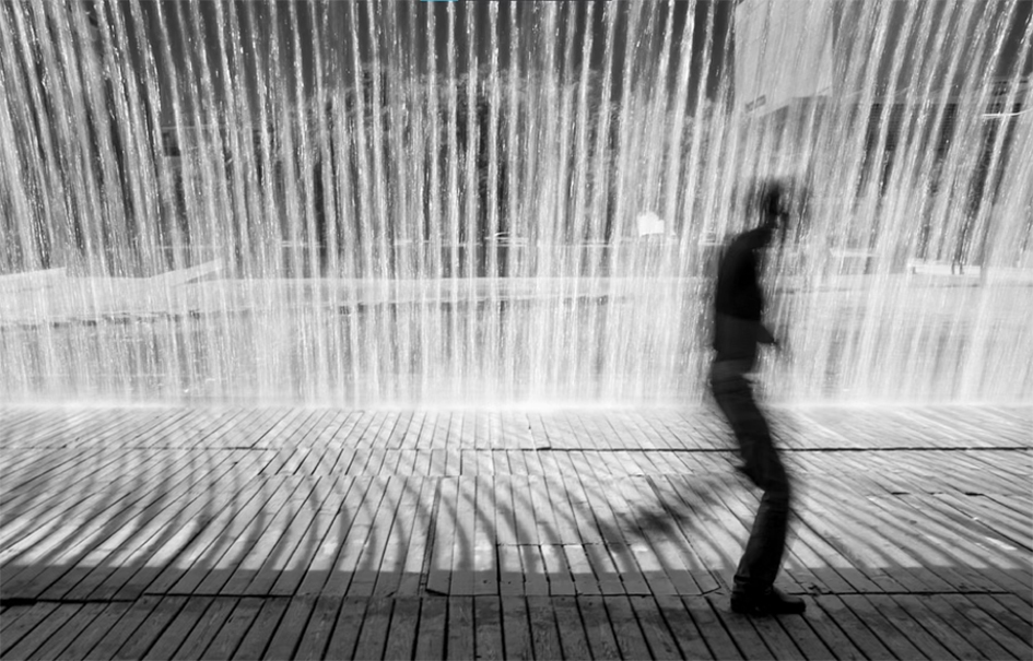 My 1/8 sec combined with an f/16 and, again, the built-in ND filter got my man dissolved in a fountain in a modern neighborhood in Lisbon East.